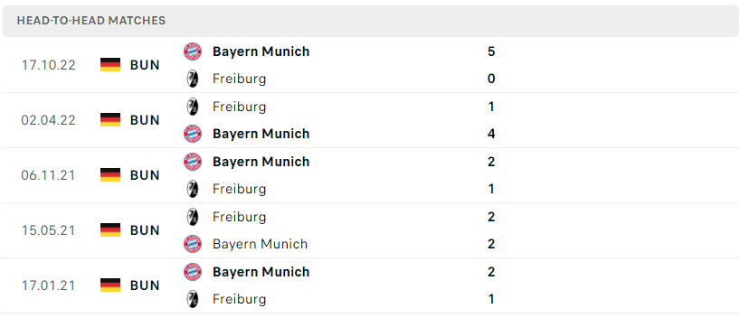 Thành tích đối đầu của Bayern Munich vs Freiburg