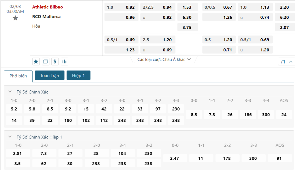 Kèo Châu Âu vẫn đang là sự ưu thế dành cho Ath Bilbao, khi mức ăn của họ đang là 1.53 trong khi con số này của các vị khách là 6.30. Trong một thời điểm mà đoàn quân Valverde đang đứng trước cơ hội rất lớn để quay trở lại top 4 thì tin chắc rằng với bản lĩnh và sự kinh nghiệm, thì họ sẽ không bỏ lỡ cơ hội góp nhặt điểm số tuyệt vời này. Những lợi thế có được sẽ dễ dàng giúp Bilbao giành trọn 3 điểm.