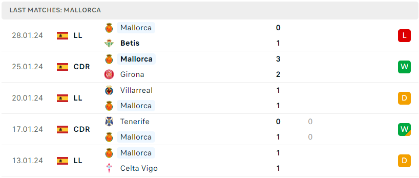 Trong khi đó, chuỗi 5 trận bất bại liên tiếp của Mallorca cũng mới bị chặn lại sau trận thua tối thiểu trước Real Betis. Mặc dù đang thi đấu khởi sắc là vậy, nhưng riêng tại La Liga đoàn quân Vicente Moreno đã trải qua đến 4 vòng đấu liên tiếp không biết đến mùi chiến thắng. Một thành tích vô cùng đáng báo động và nhất là khi cách biệt giữa họ và nhóm cầm đèn đỏ chỉ còn là 4 điểm. Vô vàn những khó khăn đang chờ đợi phía trước và họ buộc phải có động thái trở lại trước khi mọi thứ trở nên không thể cứu vãn.
