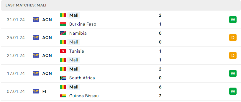 Sau khi dễ dàng vượt qua vòng bảng với vị trí nhất bảng E, Mali đã tiếp tục thể hiện bản lĩnh và thực lực của họ qua thắng lợi thuyết phục trước Burkina Faso ở vòng Knock Out, một lối đá chắc chắn và không thiếu sự kỷ luật đang biến Mali trở thành một “chú ngựa ô” đích thực tại Can Cup lần này. Dù vậy, nhưng thử thách dành cho đoàn quân Magassouba tại tứ kết sẽ là Bờ Biển Ngà, một đối thủ không hề yếu và đây sẽ là lúc “Đại Bàng” cần lột tả toàn bộ sức mạnh.