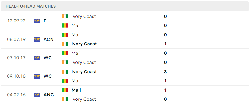Thành tích đối đầu của Mali vs Bờ Biển Ngà