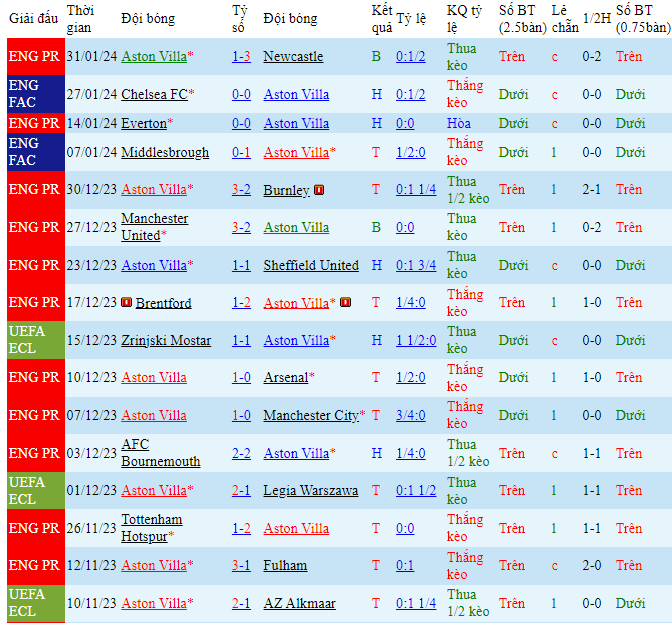 -Phong độ Aston Villa