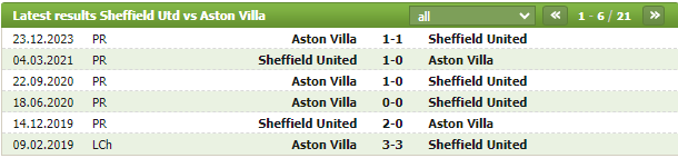 Lịch sử thi đấu của Sheffield United vs Aston Villa