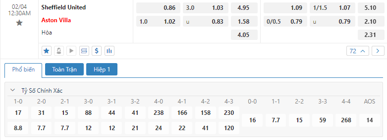 Bảng tỷ lệ kèo bóng đá trận đấu Sheffield United vs Aston Villa