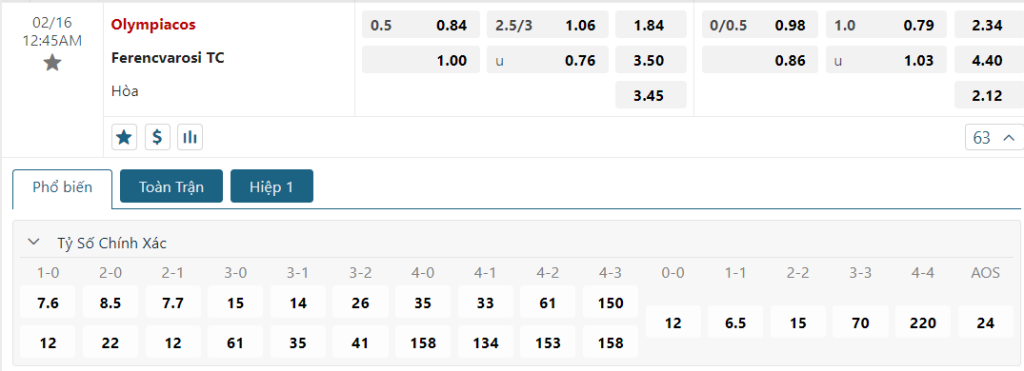 Bảng tỷ lệ kèo bóng đá trận đấu Olympiacos Piraeus vs Ferencvaros