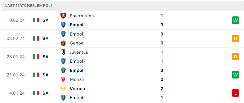 Những tín hiệu khởi sắc đang dần quay trở lại với Empoli, khi tập thể này đã bất bại trận thứ 4 liên tiếp và trong số này thì họ cũng đã xuất sắc mang về 2 chiến thắng. Chuỗi thành tích chói sáng này cũng đã giúp cho đoàn quân Davide Nicola thoát ra khỏi khu vực nguy hiểm và nắm giữ cách biệt 2 điểm. Một sự tự tin cực lớn đang hiện hữu trong lối chơi của Empoli và nếu cứ giữ vững tinh thần như hiện tại thì họ hoàn toàn có thể lạc quan thành công trụ hạng ở mùa giải này.