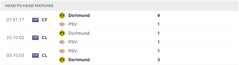 Thành tích đối đầu của PSV vs Dortmund