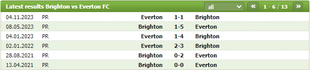 Lịch sử thi đấu của Brighton vs Everton