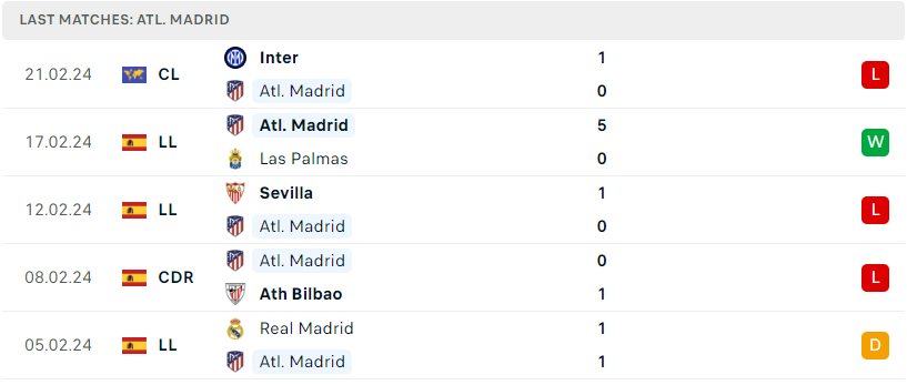Ngay sau trận thua đầy tiếc nuối trước Inter Milan tại lượt đi vòng KO Champions League, Atl. Madrid sẽ bước vào loạt trận vòng 26 La Liga bằng chuyến làm khách đến Almeria vào cuối tuần. Một cơ hội quá tốt để Rojiblancos tìm lại niềm vui chiến thắng và đồng thời chứng minh được bản lĩnh của một đội bóng mạnh bằng việc sẵn sàng đứng dậy sau thất bại.