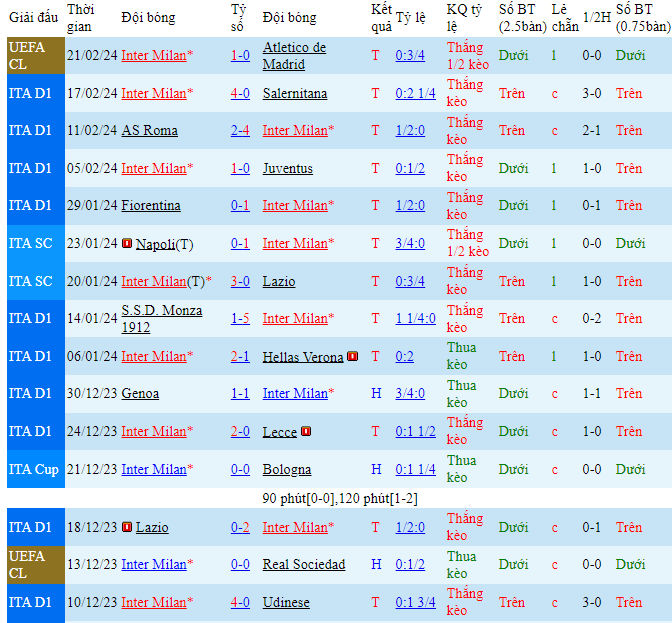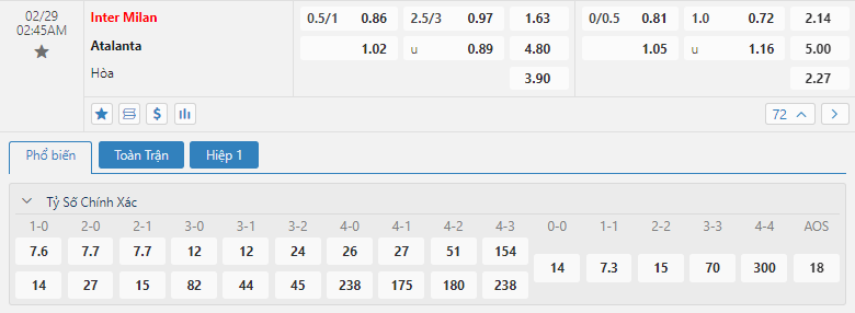 Kèo châu Âu cũng đang là sự ưu thế cho đội chủ nhà khi mức ăn của Inter Milan đang là 1.63 trong khi đó con số này của Atalanta đã là 4.80. Chắc chắn đây là một thời điểm mà Inter Milan sẽ cần phải thể hiện được bản lĩnh của mình, việc vẫn đang duy trì được một phong độ rất tốt giúp cho họ dường như có thể mở ra các toan tính trước một Atalanta đầy khó chịu và tìm kiếm lợi thế ở trận đấu sắp tới.