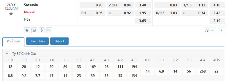 Với đẳng cấp của mình thì Napoli vẫn sẽ là cái tên nhận được sự ưu ái đến từ các nhà cái so với Sassuolo trong kèo đấu này qua mức niêm yết trên sàn giao dịch đang là 0.5. Nhìn chung với sự tệ hại mà đối thủ đang thể hiện thì cơ hội dành cho Gli Azzurri chắc chắn cũng là rất sáng sủa. Napoli sẽ phải biết cách để tạm thời quên đi những áp lực đang bủa vây họ, sử dụng lối chơi với khả năng kiểm soát quen thuộc và đồng thời cũng không quên xốc lại sự tập trung cho một hàng thủ vốn dĩ đang chơi rất tệ hại trong suốt giai đoạn đã qua. Sassuolo không phải là một vấn đề quá lớn với sự hạn chế trong nhân sự cùng với đó là khả năng thi đấu không mang lại quá nhiều tính đột biến cao. Thống kê cho thấy, phong độ sân nhà của Sassuolo ở mùa giải năm nay cũng là rất kém cỏi, họ mới chỉ giành được đúng 3 chiến thắng tại mái ấm của mình tính cho đến hiện tại. Đó là con số có thể là sự động viên dành cho Napoli trong việc cố gắng nâng cao thành tích sân khách của họ. Sự chắt chiu và tập trung sẽ là thứ mà Napoli sẽ cần phải có được để qua đó giành lấy 3 điểm trước Sassuolo.