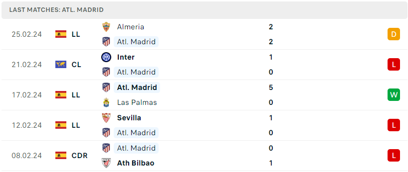 Có vẻ như chuỗi trận sa sút đang quay trở lại với tập thể thành Madrid khi đoàn quân Diego Simeone tiếp tục gây thất vọng bởi trận hòa bạc nhược trước Almeria đang đội sổ BXH ở vòng đấu trước. Trước đó, Rojiblancos cũng đã để thua trước Inter tại lượt đi vòng 1/8 Champions League. Chưa nói, trong 6 lần ra sân gần nhất thì tập thể này cũng chỉ mang về duy nhất 1 chiến thắng trước Las Palmas. Một phong độ báo động đỏ và Atl. Madrid buộc phải có những động thái tích cực trở lại.