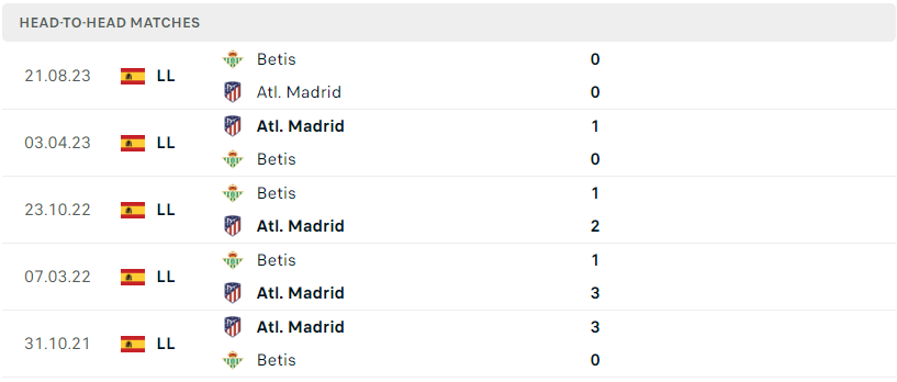 Thành tích đối đầu của Atl. Madrid vs Betis