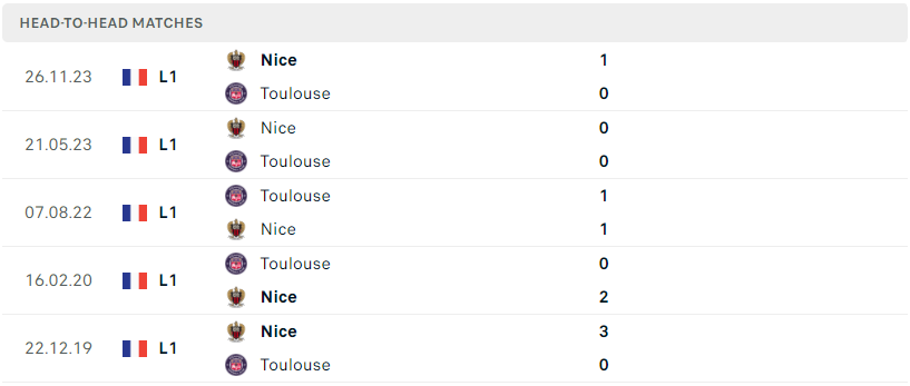Thành tích đối đầu của Toulouse vs Nice
