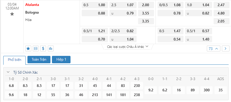 Kèo châu Âu cũng đang là sự ưu thế cho đội chủ nhà khi mức ăn của Atalanta đang là 2.00 trong khi đó con số này của Bologna đã là 3.70. Chắc chắn đây là một thời điểm mà Atalanta sẽ cần phải thể hiện được bản lĩnh của mình, việc vẫn đang duy trì được một phong độ rất tốt giúp cho họ dường như có thể mở ra các toan tính trước một Bologna đầy khó chịu và tìm kiếm lợi thế ở trận đấu sắp tới.