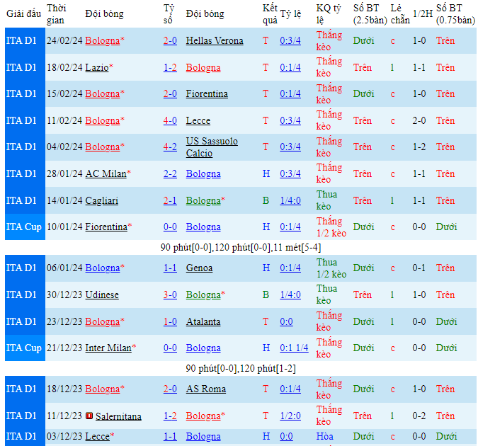 Trong khi đó với Bologna, đội khách thì như thường lệ vẫn duy trì một phong độ tương đối ổn định. Họ có chiến thắng 2-0 trên sân nhà trước Verona để qua đó đánh dấu vòng đấu thứ 5 liên tiếp được nếm trải niềm vui. Hiện tượng của Serie A năm nay đang thực sự làm rúng động giới mộ điệu với khả năng thi đấu của mình và vị trí thứ 4 trên BXH hiện tại cùng 48 điểm trong tay rõ ràng đã phần nào nói lên được khao khát của Bologna. Chắc chắn họ sẽ còn gây ra nhiều khó dễ cho Atalanta ở vòng đấu sắp tới. Màn so tài sẽ là đôi chút sự lấn lướt đến từ chủ nhà và khả năng nổ tài là hoàn toàn có thể xảy ra.