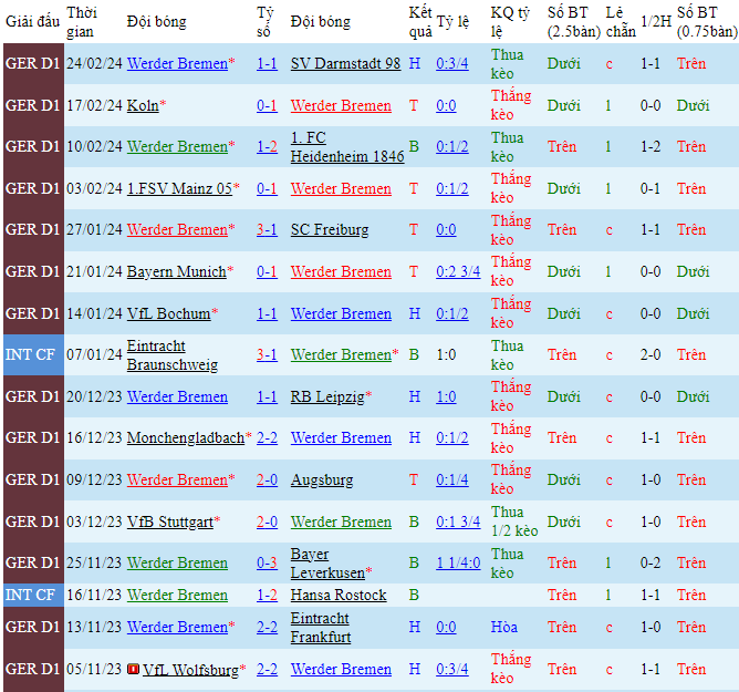 -Phong độ Werder Bremen