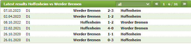Lịch sử thi đấu của Hoffenheim vs Werder Bremen
