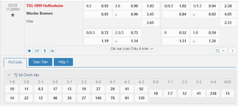Kèo châu Âu cũng đang là sự ưu thế cho đội chủ nhà khi mức ăn của Hoffenheim đang là 1.93 trong khi đó con số này của Werder Bremen đã là 3.45. Một khoảng thời gian vô cùng khó khăn và hơn lúc nào hết Hoffenheim sẽ cần phải có được sự quyết tâm vươn lên cùng với đó là những giải pháp để đưa mình trở lại với guồng quay hiện tại. Các lợi thế đang có sẽ là cơ sở để họ có thể nghĩ đến một chiến thắng trước Werder Bremen ở trận đấu tới.