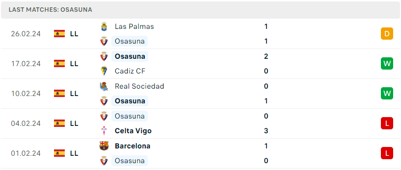 Mạch trận thăng hoa tiếp tục được Osasuna duy trì bằng 1 điểm có được trong chuyến hành quân đến Las Palmas ở vòng đấu gần nhất. Một thời điểm đoàn quân Jagoba Arrasate đang ổn định trở lại và họ hiện cũng đã leo lên vị trí thứ 11 trên BXH. Dẫu sao thì Osasuna vẫn luôn được đánh giá là một ẩn số đầy khó lường tại La Liga và trong một thời điểm họ đang có dấu hiệu hồi sinh thì tin chắc rằng tập thể vùng Navarra sẽ không dễ bị vượt qua trong thời gian sắp tới.