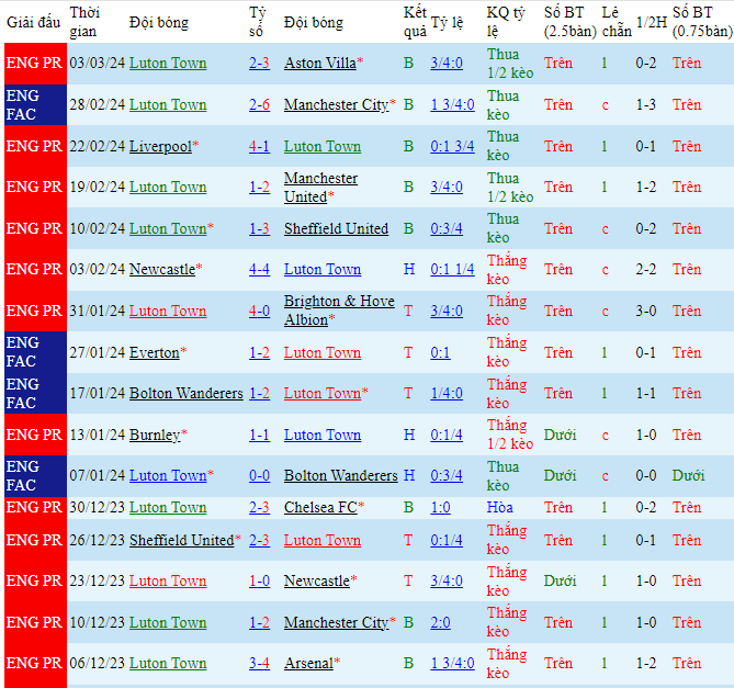 Trong khi đó với Luton Town, hi vọng để có thể ở lại EPL mùa giải sang năm đang trở nên mong manh hơn bao giờ hết với đội bóng áo cam này. Các vị khách vừa trải qua trận thua thứ 4 liên tiếp tại giải đấu sau khi để thua trước Aston Vllla với tỉ số 2-3 trên sân nhà của mình. Sự nhạt nhòa quá lớn khiến cho Luton Town dường như bất định và vị trí áp chót trên BXH lúc này cùng vỏn ven 13 điểm là điều tất yếu phải đến với họ. Có lẽ điều khó sẽ khiến cho Luton Town khó lòng có thể thi đấu tốt ở màn hành quân đến sân của Crystal Palace ở vòng đấu tiếp theo. Trận đấu sẽ là sự lấn lướt của đội chủ nhà, khả năng cũng sẽ có nhiều bàn thắng được ghi.