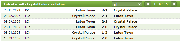 Lịch sử thi đấu của Crystal Palace vs Luton Town