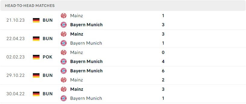 Thành tích đối đầu của Bayern Munich vs Mainz