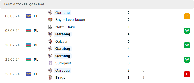 Trong khi đó, màn trình diễn của đại diện Azerbaijan trong màn tiếp đón Leverkusen vừa qua là rất đáng khen, dù cho bị đánh giá thấp hơn rất nhiều so với đối thủ nhưng với việc được chơi trên sân nhà Qarabag đã thi đấu đầy nổ lực và thậm chí khiến cái tên đang bất bại kể từ đầu mùa suýt nếm phải trái đắng. Một tín hiệu tích cực và đoàn quân Gurban Gurbanov chắc chắn sẽ muốn duy trì điều đó trong cuộc tái đấu tới. Dù vậy, nhưng mọi chuyện sẽ không còn dễ dàng như trận chiến vừa qua.