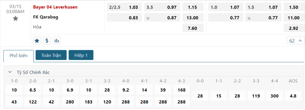 Kèo Châu Âu tiếp tục là sự áp đảo dành cho Leverkusen, khi mức ăn của họ là 1.15 và con số này của đội khách lên đến 13.00. Nhìn chung, trong một thời điểm càng thi đấu càng hưng phấn và sở hữu tỷ lệ thắng cực cao trên sân nhà thì một Qarabag vốn không được đánh giá cao sẽ khó có thể làm nên được kỳ tích như trận lượt đi ở màn tái đấu tới.
