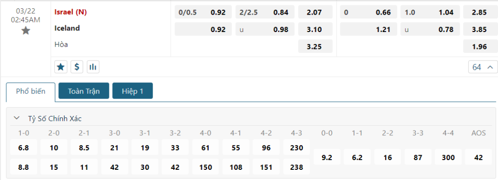 Sự ưu ái vẫn đang thuộc về Israel ở kèo Châu Âu, khi mức ăn của họ là 2.07 và con số này của đội khách là 3.10. Mặc dù vậy, nhưng sự chênh lệch này là không quá nhiều và trong một trận đấu trên sân trung lập cũng như không có quá nhiều cách biệt về trình độ giữa hai đội và hơn hết là sự xuống dốc của Israel thì Iceland vẫn có đủ cơ sở để nghĩ về một kết quả thuận lợi trong trận đấu tới đây.