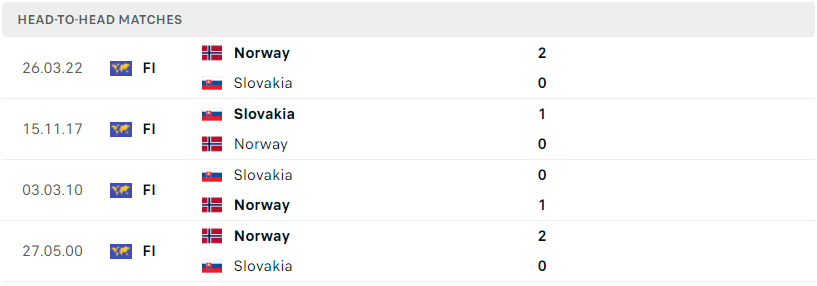 Thành tích đối đầu của Na Uy vs Slovakia