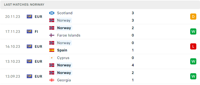 Dù Na Uy đang nhận được sự ủng hộ từ lịch sử chạm trán, với 3 chiến thắng sau 4 lần đụng độ. Tuy nhiên, đó là câu chuyện của nhiều năm về trước. Sự tự tin và lối chơi hiệu quả của các vị khách ở hiên sẽ là thứ vũ khí lợi hại mà Na Uy không thể lường trước. Một trận đấu với thế trận rượt đuổi, nhưng sau cùng vẫn dừng lại ở tỉ số hòa.