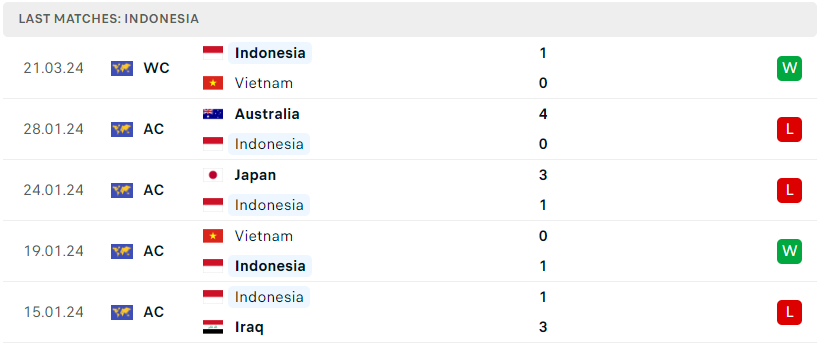 Trong khi đó với Indonesia, sau kỳ Asian Cup đầy thành công với việc đã lọt vào đến vòng đấu loại thì tập thể “xứ vạn đảo” tiếp tục gây bất ngờ khi đánh bại được ĐT Việt Nam, đối thủ mà họ đã nhiều lần nhận trái đắng trong quá khứ. Có vẻ như việc bổ sung dàn nhân sự nhập tịch đang giúp cho Indonesia tiến bộ một cách nhanh chóng. Dù vậy, nhưng nếu muốn giành vé tiến vào vòng loại thứ 3 thì điều kiện cần là họ phải vượt qua được thử thách mang tên Việt Nam 4 ngày sau.