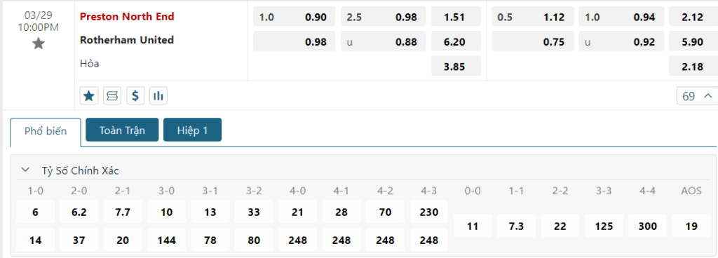 Với lợi thế là sân nhà cùng với sức mạnh vượt trội thì hiển nhiên Preston vẫn sẽ là cái tên nhận được sự ưu ái trong kèo đấu này, qua mức giá trên sàn giao dịch là 1.0. Nhìn chung, với phong độ thê thảm của Rotherham ở thời điểm hiện tại cùng với lối chơi thiếu nghị lực và hiệu quả của họ thì tin chắc rằng chuyến đi đến Preston sắp tới sẽ được dự báo là “lành ít dữ nhiều”. Chưa kể, đoàn quân Leam Richardson cũng đã không nếm mùi chiến thắng trong 3 tháng vừa qua và phong độ trên sân khách của họ cũng thật sự đáng báo động khi vẫn chưa có bất kỳ trận thắng nào sau 21 lần làm khách kể từ đầu mùa. Sức mạnh vượt trội cùng với tâm thế của một đội bóng cửa trên sẽ là chìa khóa mở ra một thắng lợi dễ dàng dành cho Preston trong trận đấu sắp tới.