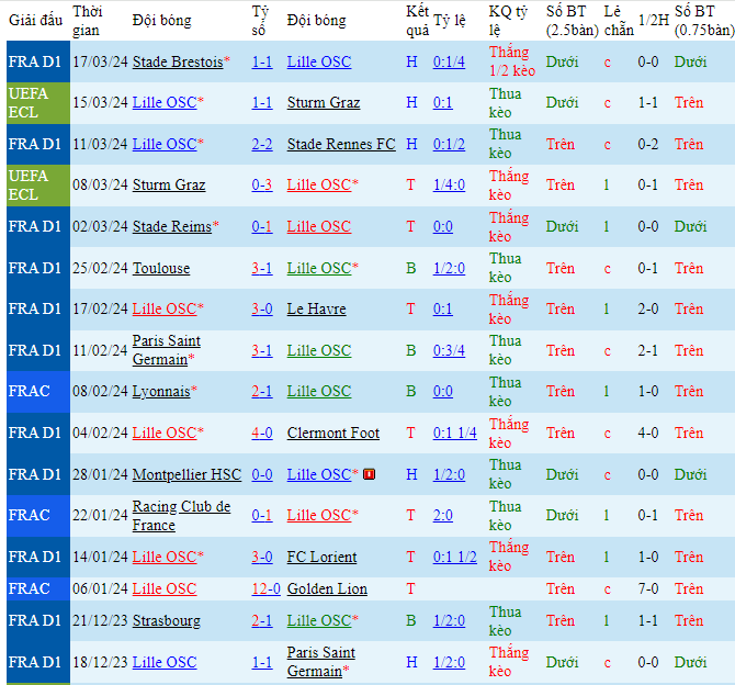 Phong độ đội bóng Lille vs Lens
