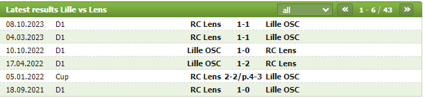 Lịch sử thi đấu của Lille vs Lens