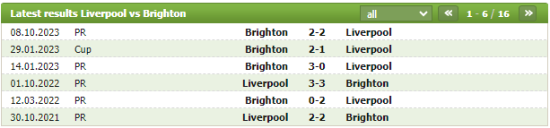 Lịch sử thi đấu của Liverpool vs Brighton