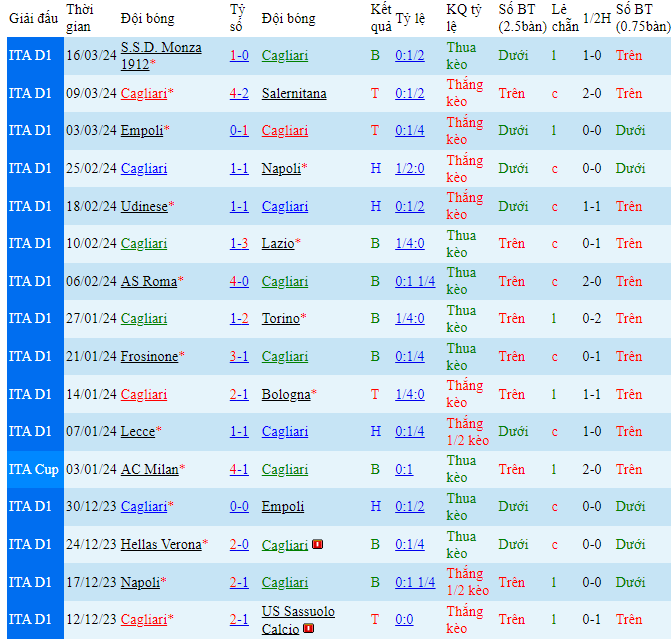 Chuỗi ngày ấn tượng của Cagliari đã không thể tiếp tục tiếp diễn khi mà họ đã phải chịu một trận thua có phần đáng tiếc trước Monza ở vòng đấu vừa rồi. Tân binh này cũng đang rất cố gắng để giúp cho mình có thể bứt lên trong cuộc chiến trụ hạng ở thời điểm hiện tại và họ chắc chắn sẽ phải nỗ lực rất nhiều trong trận đấu chung kết ngược với Verona ở vòng đấu tiếp theo.
