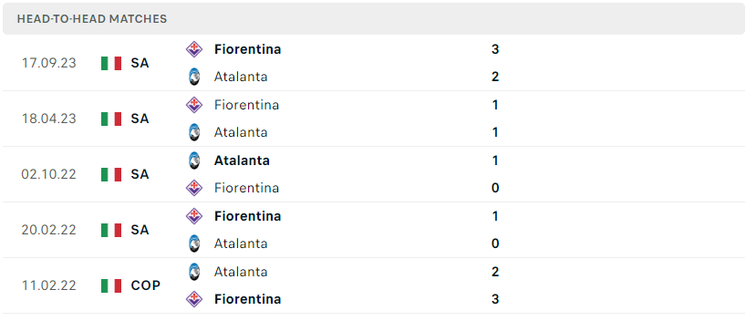 Thành tích đối đầu của Fiorentina vs Atalanta