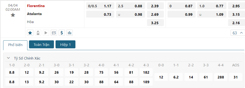 Kèo Châu Âu vẫn là sự ưu ái đôi phần dành cho Fiorentina, mặc dù vậy nhưng sự chênh lệch giữa hai mức ăn là không nhiều (2.39 so với 2.69). Về cơ bản, trong một thời điểm mà Viola đang cho thấy nhiều sự chênh choạc, thì rõ ràng việc đả bại một Atalanta tràn đầy năng lực sẽ không phải là nhiệm vụ dễ. Do đó, khả năng hai đội cầm chân nhau là rất cao.