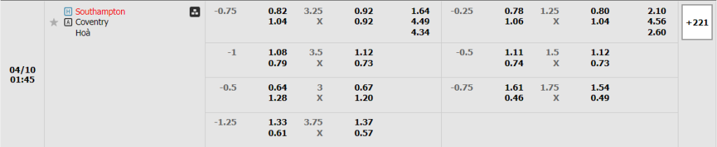 Kèo Châu Âu nghiễm nhiên vẫn là sự nhỉnh hơn dành cho các vị Thánh, khi mức ăn của họ là 1.64 và con số này của các vị khách là 4.49. Một con số đủ để thấy đôi phần sự nhỉnh hơn của Southampton so với chính Coventry ở hiện tại. Những lợi thế có được cộng kèm với quyết tâm vươn lên sẽ đáp lại Southampton bằng chiến thắng trọn vẹn.