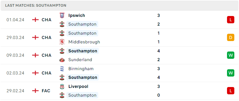 Phong độ đội bóng Southampton vs Coventry