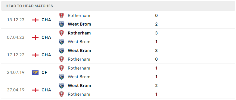 Thành tích đối đầu của West Brom vs Rotherham
