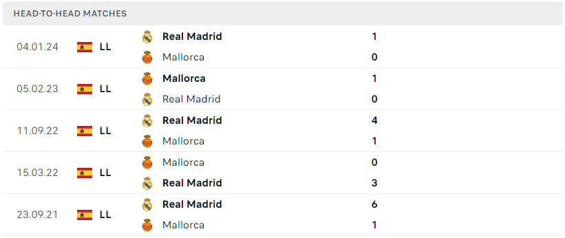 Thành tích đối đầu của Mallorca vs Real Madrid
