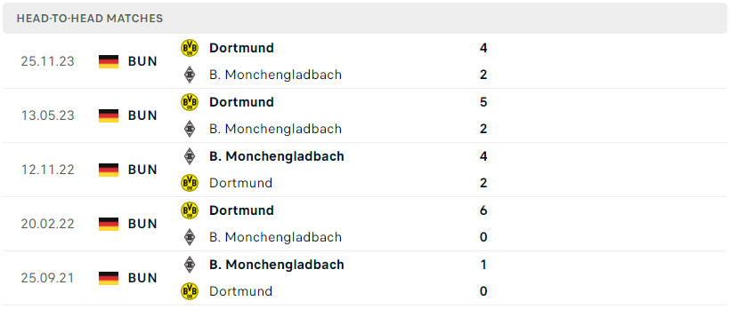 Thành tích đối đầu của B. Monchengladbach vs Dortmund