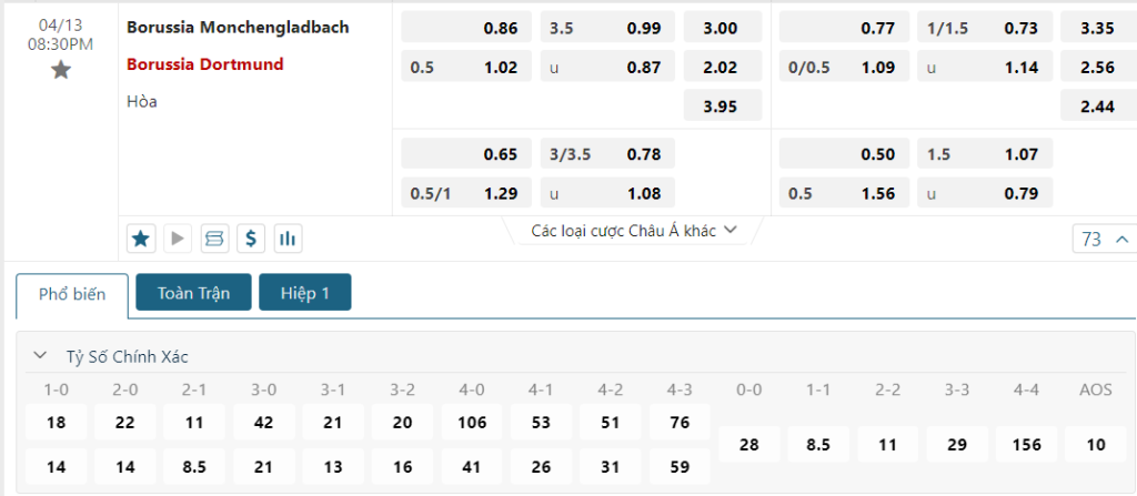 Bảng tỷ lệ kèo bóng đá trận đấu B. Monchengladbach vs Dortmund
