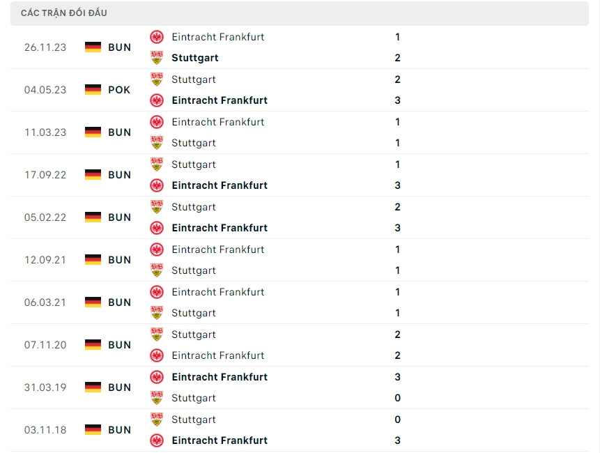 Lịch sử thi đấu của Stuttgart vs Eintracht Frankfurt