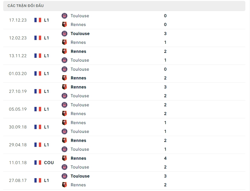 Lịch sử thi đấu của Rennes vs Toulouse
