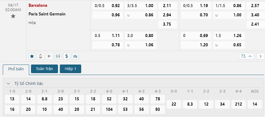 Kèo châu Âu cũng đang là sự ưu thế nhỏ cho đội chủ nhà khi mức ăn của Barcelona đang là 2.11, trong khi đó con số này của PSG là 2.94. Lợi thế ở trận lượt đi sẻ giúp đoàn quân của HLV Xavi dễ đá hơn rất nhiều, họ có thể dễ dàng toan tính khi được thi đấu trên sân nhà, trong khi sự nôn nóng có thể sẻ khiến PSG trả giá bằng một thất bại tâm phục khẩu phục nữa trước đối thủ.