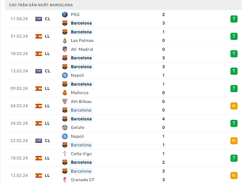 Phong độ đội bóng Barcelona vs PSG
